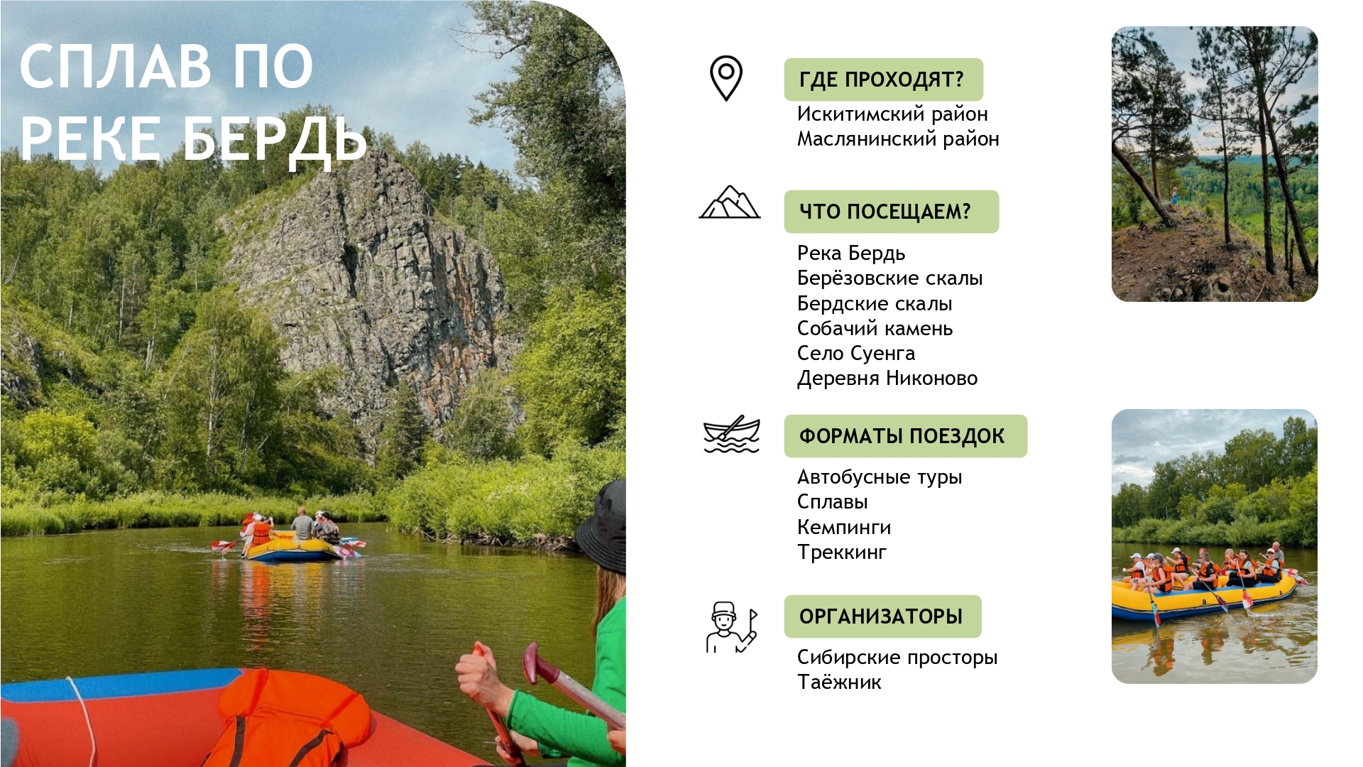 Бердские скалы, Караканский и Заельцовский боры уже стали точками притяжения для тысяч путешественников. Здесь работают туристические базы и кемпинги, проложены маршруты для любителей активного отдыха и единения с природой.
